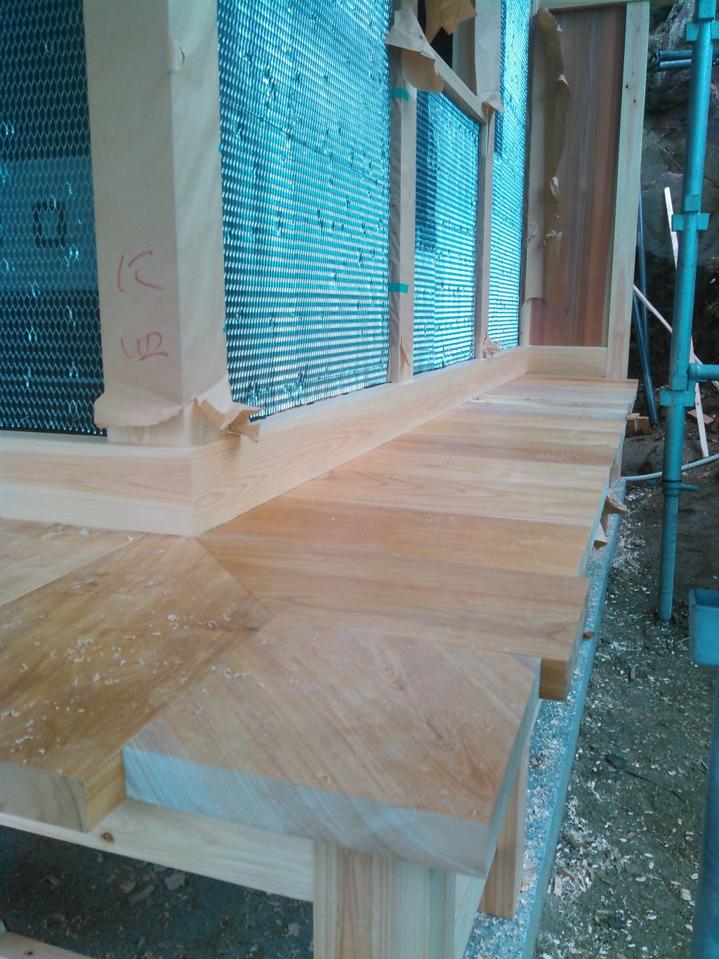 そんな今日は、神社の外部の床板張り工事からでした。