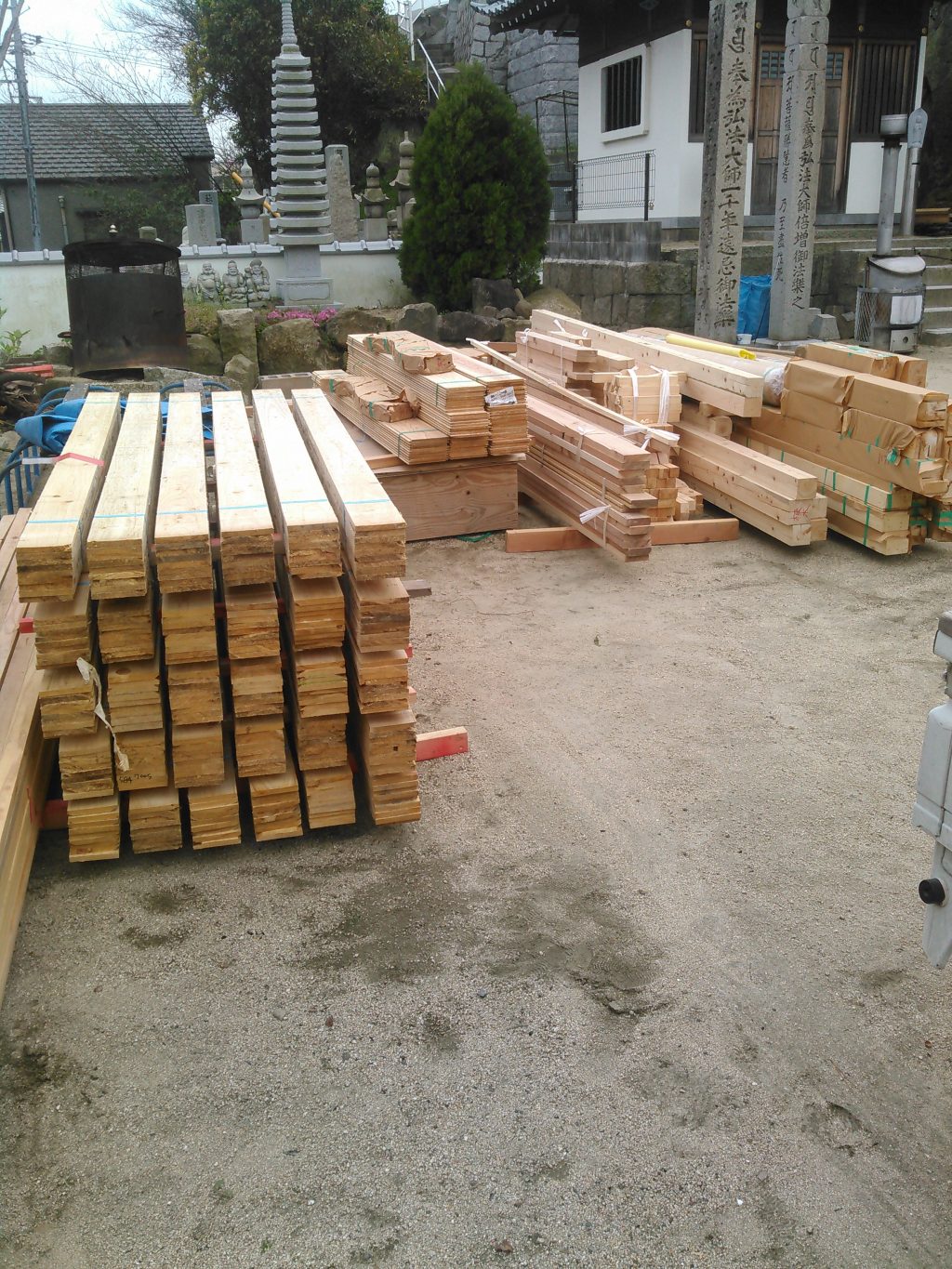 今日は、作業場での加工を予定しとったんじゃけど、明日の天気が良くないとの事で、急遽神社の材料の搬入をする事に変更しました。