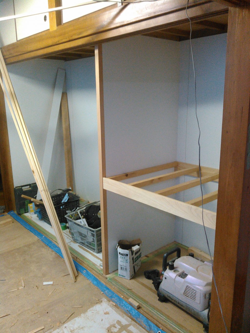 本日の作業としては、床の横に付く「天袋、地袋」と呼ばれる、箱のような物の製作、チョロットなげしなどの取り付け作業でした。