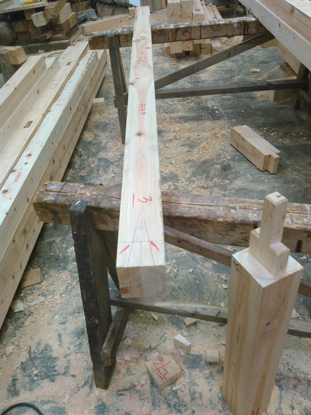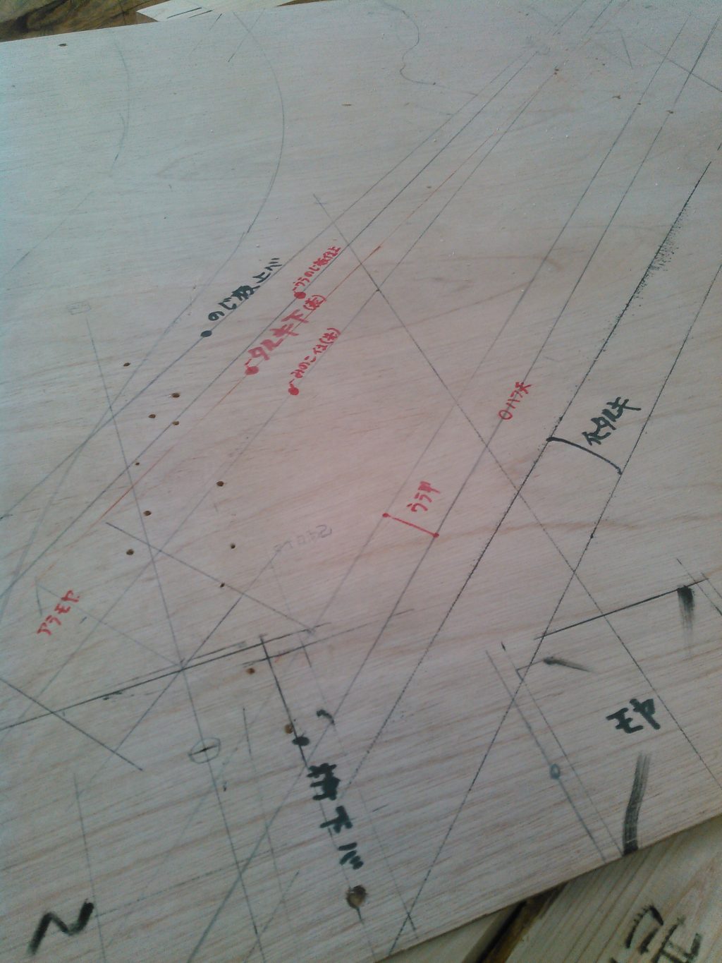 大方、見える柱、梁など化粧材の墨付けも終わり、これからは原寸図をもとに見えない屋根の内部の墨付けに入るんですが、なかなかやりなれない仕事のため、作業もはかどらず、加工担当の社長が風邪でお休みということで、少々仕事を拝借して、今日は気分転換に穴掘り作業に方向転換。