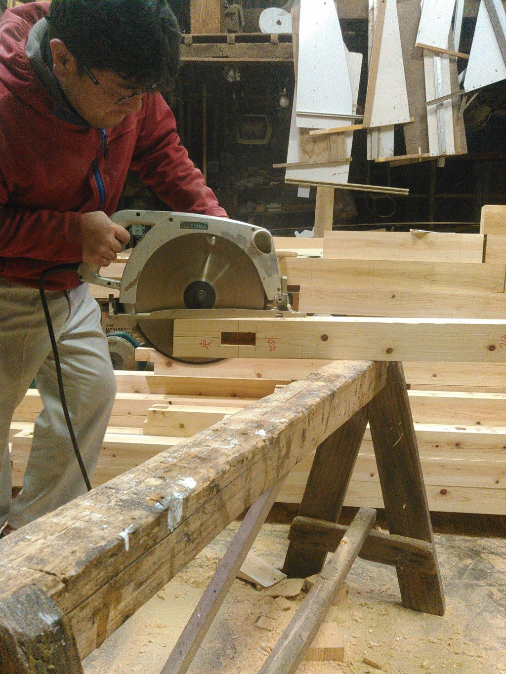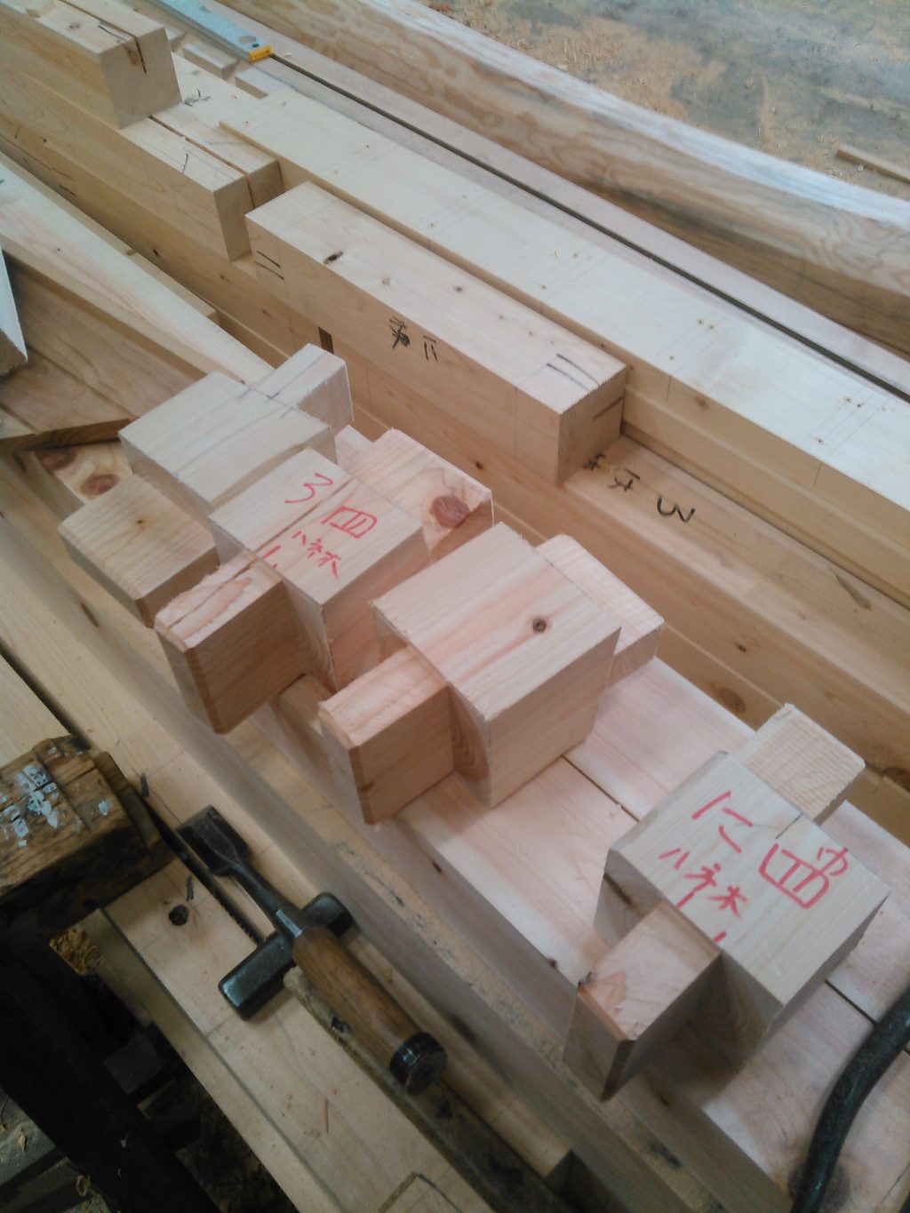 特に、難しい作業も無く、ただひたすら木材の加工。墨(線)とおり、のこぎりやノミを入れ、仕口、継手といった、個所を作る作業に没頭。そんなで、今日の予定していた、K様邸の畳入れ替えの約束を「忘れとったぁ!!!!」で遅刻をしてしまったトラブルも。。。。