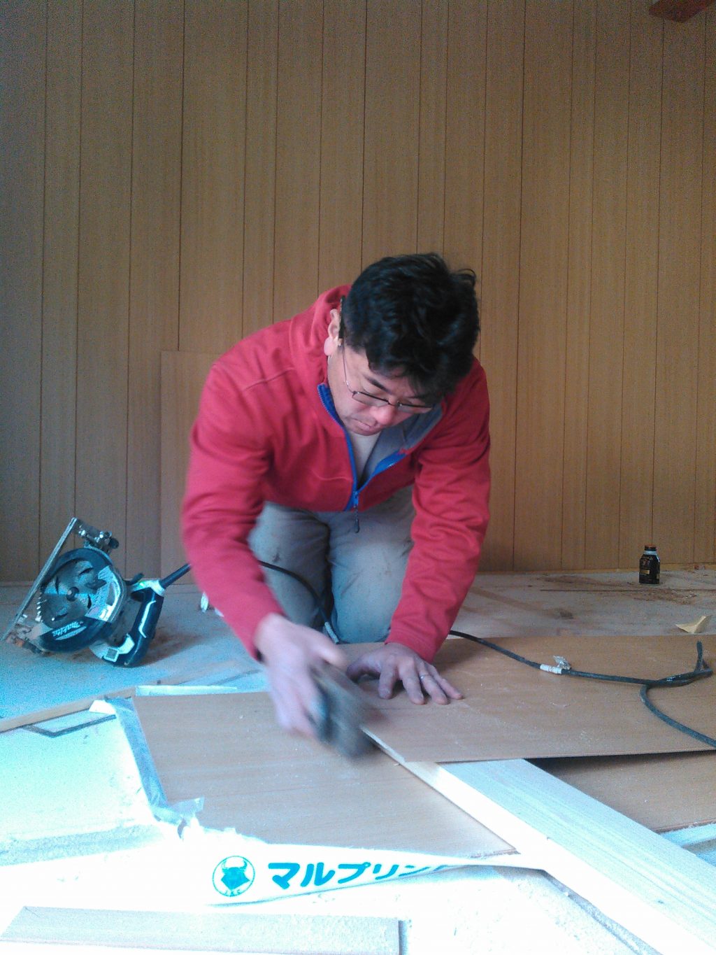 今回は、プリントベニヤと呼ばれる壁材を、張り込む作業。最近ではあまり使う事はなくなりましたが、クロスや、漆喰などの仕上げ材に比べ、見た目さえ我慢すれば、工事費は割安で、何といっても「強い!!!。」