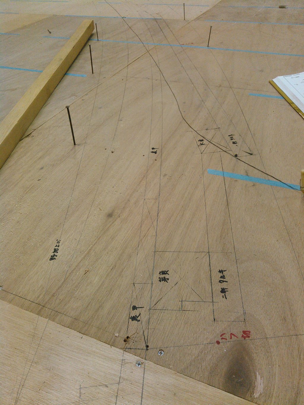 そして、午後からは、神社の原寸図と呼ばれる、実物大の大きさで設計図の作成に社長と二人、ゴチャゴチャ・・・言いながら奮闘中。