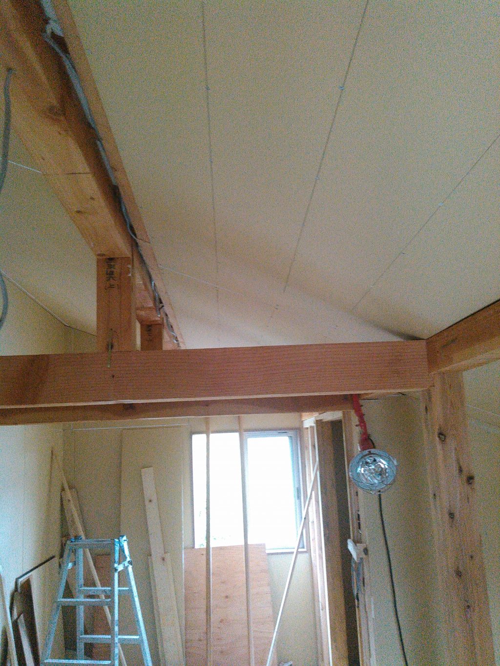 そんな今日は、土曜日から、クロス屋さんが入ってくれるため、大工工事の追い込みをかけて石膏ボードの張る作業、建具枠の取り付けと、親子での共同作業。