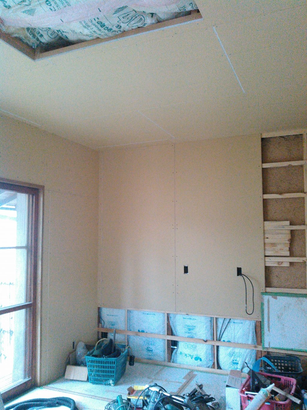 作業内容としては、壁のMクロスと呼ばれる、コンパネに、紙を貼った板を、ペタペタ・・・張っていく作業ですが、石膏ボードの嫌いな僕にとっては、気持ちよく作業出来た、一日でした。