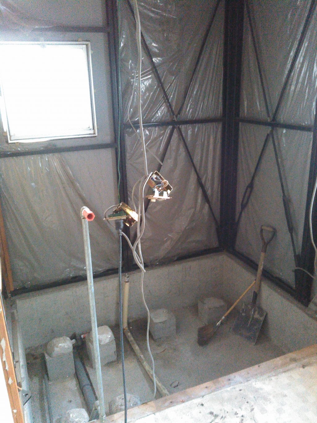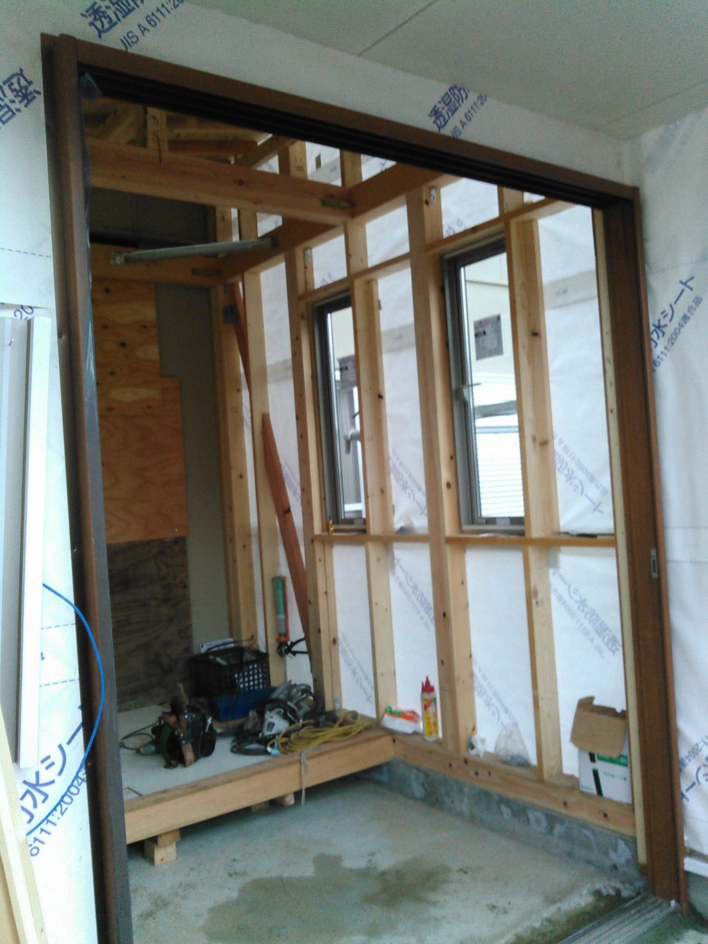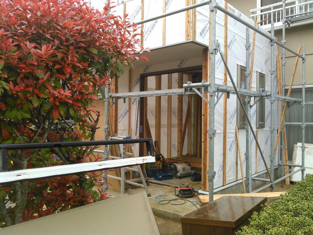 玄関の増築部分では、サッシ枠の取り付け、玄関框の取り付け、床の木組みへと、工事は順調に進み、だんだんカタチになってきました。