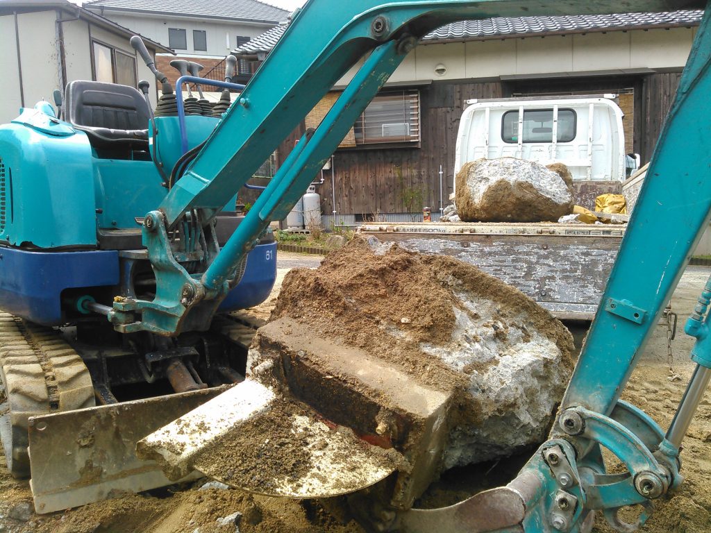 スコップでなんぼ掘っても、基礎の底の部分が見えず、「どがになっとんなら・・・」と思いながら、汗だくで、掘りましたが、結局人力では「どがにもならん・・・」と判断して、リース屋さんに行って、小さいユンボーを借りてきて、掘り出したところ、