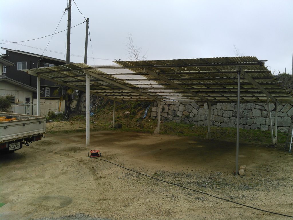 ビニールの波板を外し、骨組みの鉄骨を一本ずつ切り、なんとか午前中までには、ばらし終えましたが、昼飯を食べに帰る間に、雨が・・・
