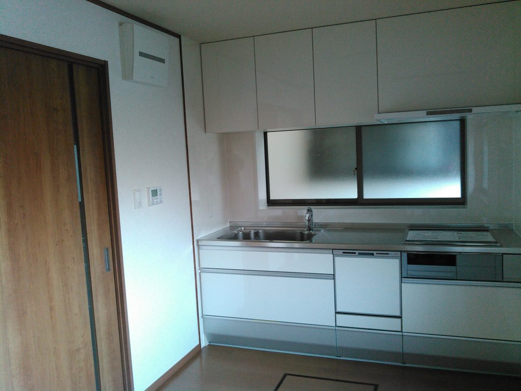 スッキリした白い流し台と、吊戸棚。清潔感があって、キレイでした。