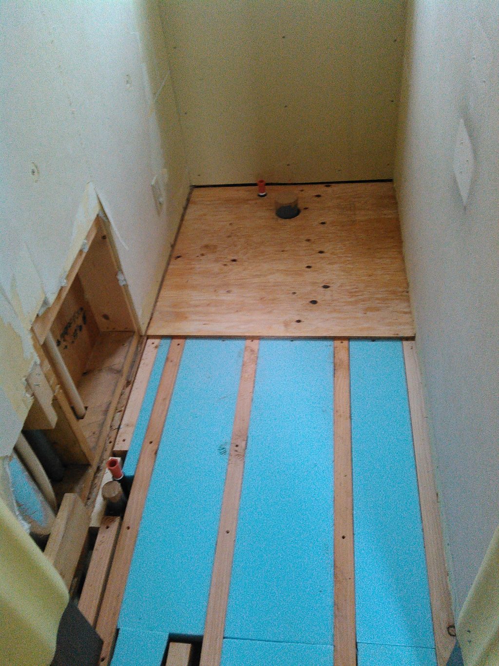 その後ろを追うように、トイレ、洗面所の床組みを作り、その後はフローリング張り。