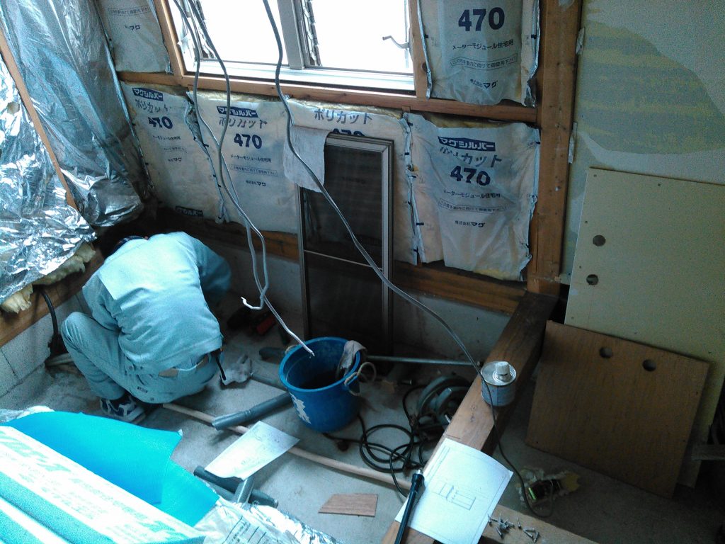 その後、岡山のH様邸へ移動。水道屋さんが朝から、トイレ、洗面所、ユニットバスの配管を行なってくれていました。