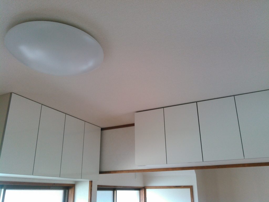 今回は一階部分ほとんどの改造工事でしたが、やっと床の養生(建物を保護する物)を外し、建具の取り付け、電気屋さんによるスイッチ、照明器具等の取り付けを行なってもらい、午後からは嫁さんによる拭き掃除をしてもらい、なんとか99%までの完成までいきました。