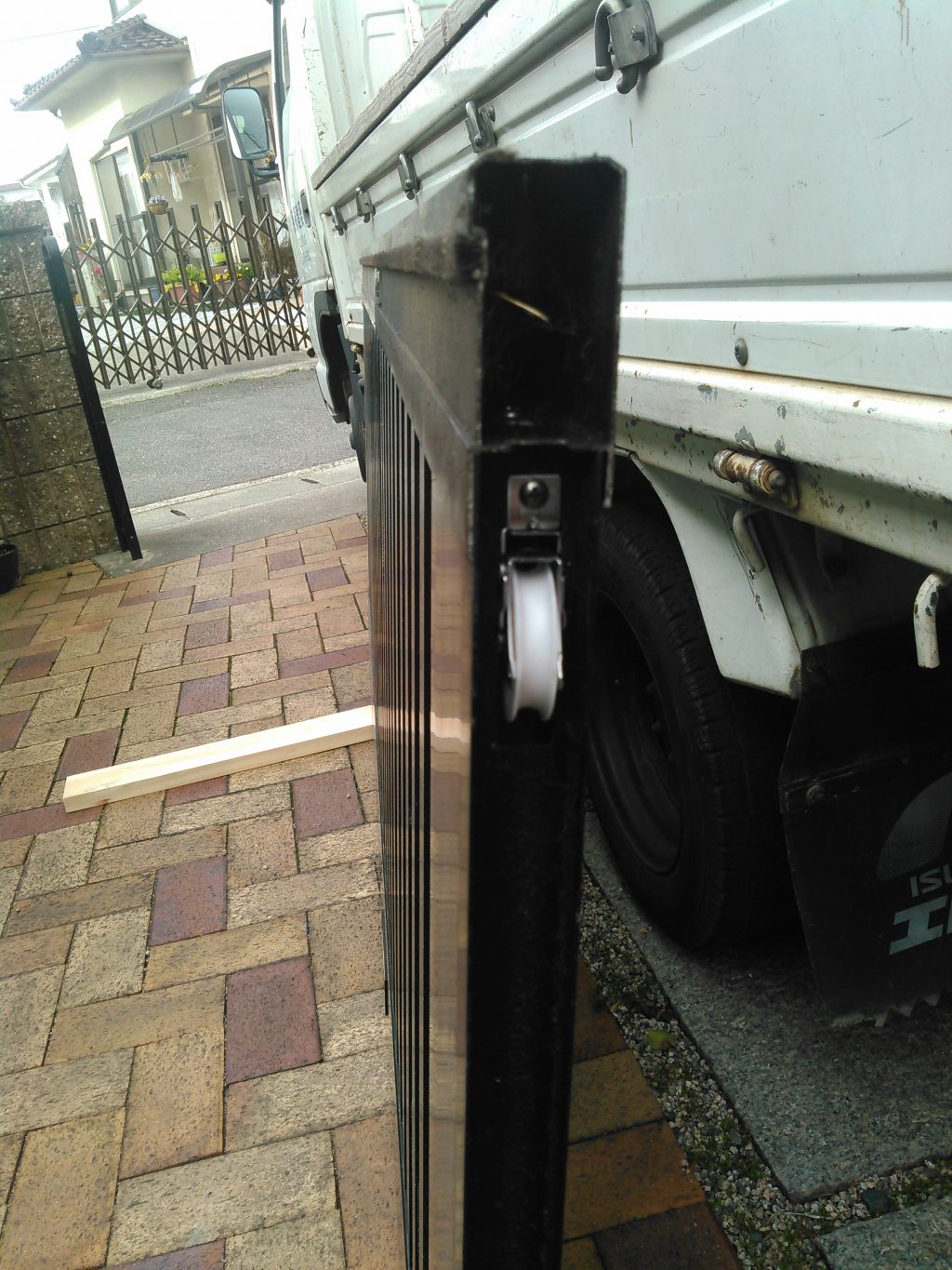 そんな二人の邪魔をしてはおえんので、K様邸の近所に住んでいる、親戚のおっちゃんのお家で玄関引戸の戸車(タイヤの部分)の交換でお邪魔させてもらい、作業時間わずか10分程度で完了。