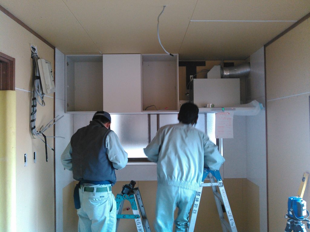 児島のK様邸では、朝から流し台の組立で、お世話になっている設備やさんが、二人で壁のパネルを貼ってその後システムキッチンの組立、現場の中はダンボールの箱でいっぱい。